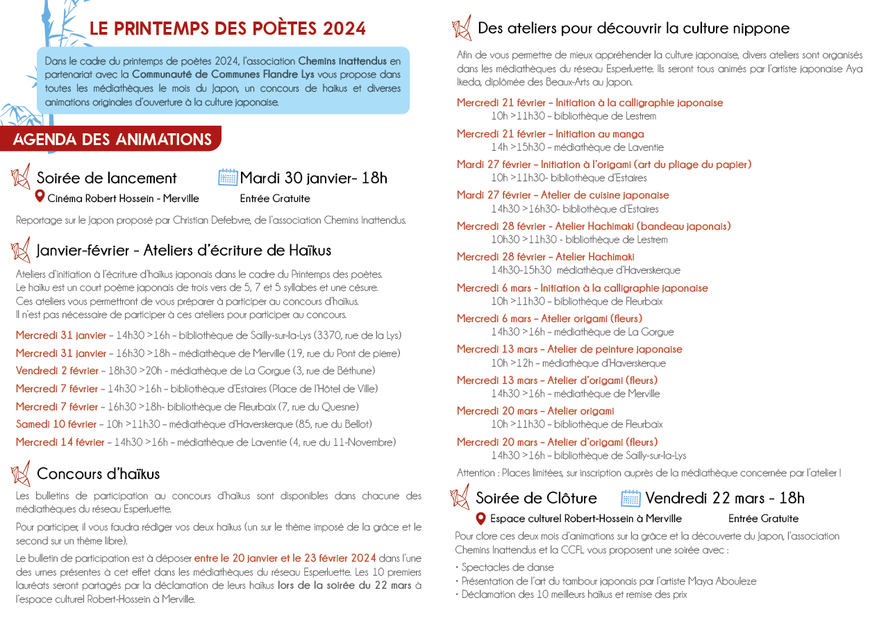 - Concours d'Haïkus (télécharger le coupon d'inscription et le règlement) ouvert du 20 janvier au 23 février 2024 !