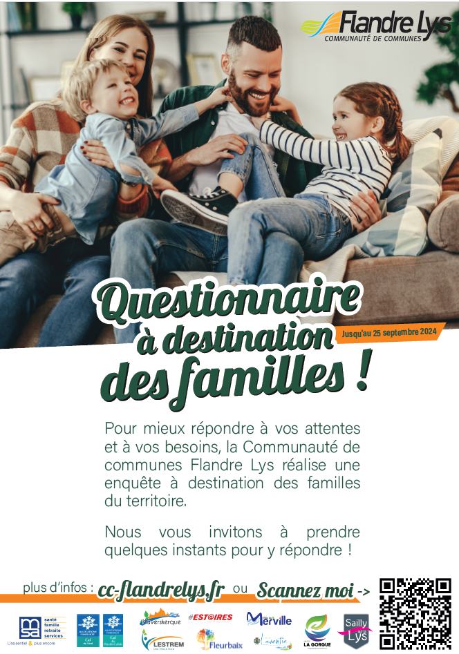 La Communauté de communes Flandre Lys vous invite à répondre au questionnaire concernant les familles du territoire et leurs besoins afin de pouvoir mieux vous accompagner dans votre quotidien !